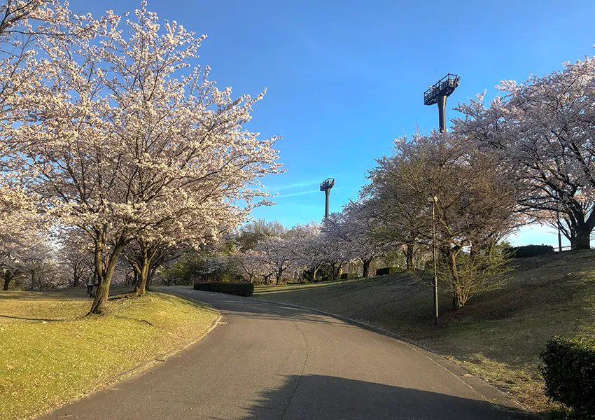 春には園内のソメイヨシノが一斉に咲き誇り、散策路には桜の枝が重なり合う美しい桜トンネルが生まれます。芝生広場や遊具も整っており、お子様連れにも人気の公園です。満開はもちろん、花びらが舞い散る頃には地面が淡いピンク色に染まり、静かで風情ある春景色をお楽しみいただけます。
