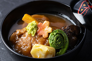 加賀特産のすだれ麩、季節の加賀野菜を使った郷土料理です。治部煮専用の治部椀でお出しします。